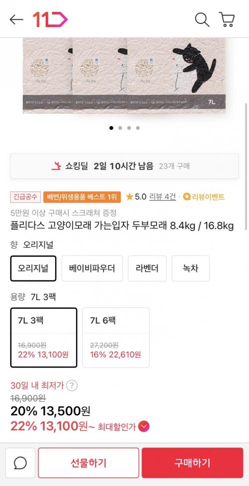 [11번가] 고양이 가는입자 두부모래 2.8kg 3팩 (13,500원/무료배송) > 국내핫딜