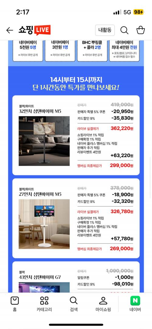 네이버 멤버십+라이브 할인+리뷰 이벤트 4만하면