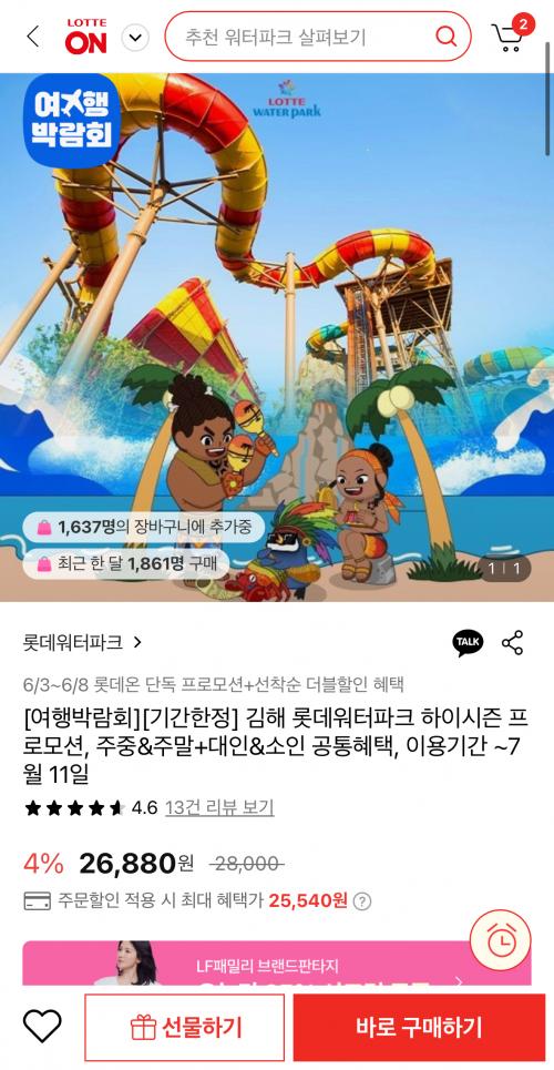 [롯데온] 김해 롯데워터파크 하이시즌 프로모션 (25,540원/무료) > 국내핫딜