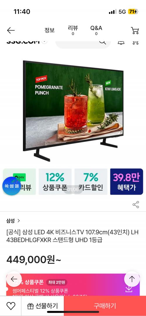 [SSG] 삼성 LED 4K 비즈니스TV 107.9cm(43인치) LH43BEDHLGFXKR 스탠드형 UHD 1등급 (398,970원/무료)
