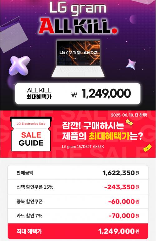 15%쿠폰 + 6만원 중복할인 + 7% 카드할인 가격이에요
