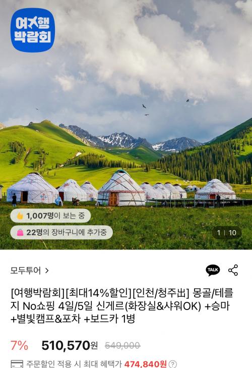 인천/청주 출발 몽골 신게르 No쇼핑 패키지 47만원대네요