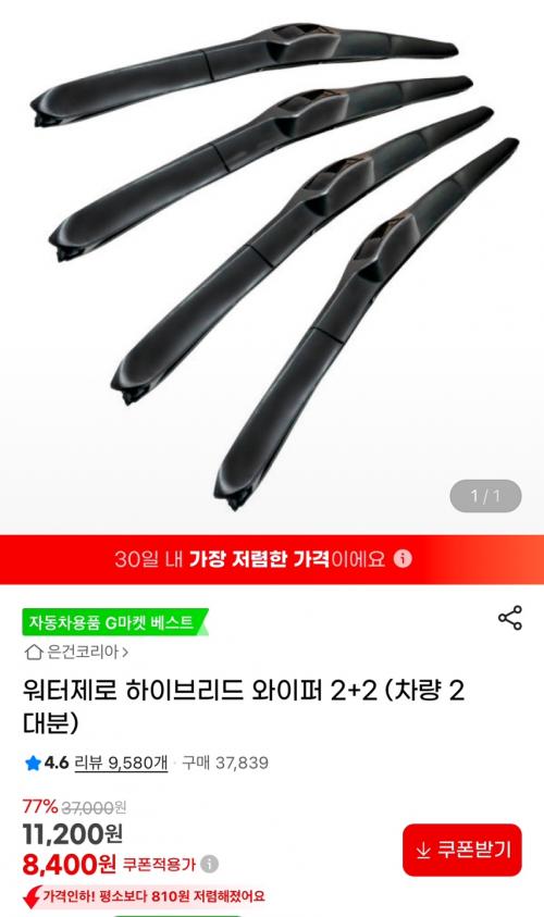워터제로 하이브리드 와이퍼 2+2 (차량 2대분) 8,400원 저렴하네요