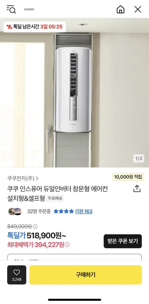 [카카오톡딜] 쿠쿠 창문형에어컨 할인 (397,947원/무배) > 국내핫딜