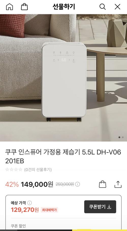 [카카오] 쿠쿠 제습기 129,270원 특가