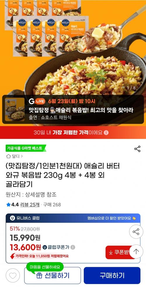 [g마켓] 애슐리 볶음밥 8인분 4인분씩 골라담기(유클 13,600원) > 국내핫딜