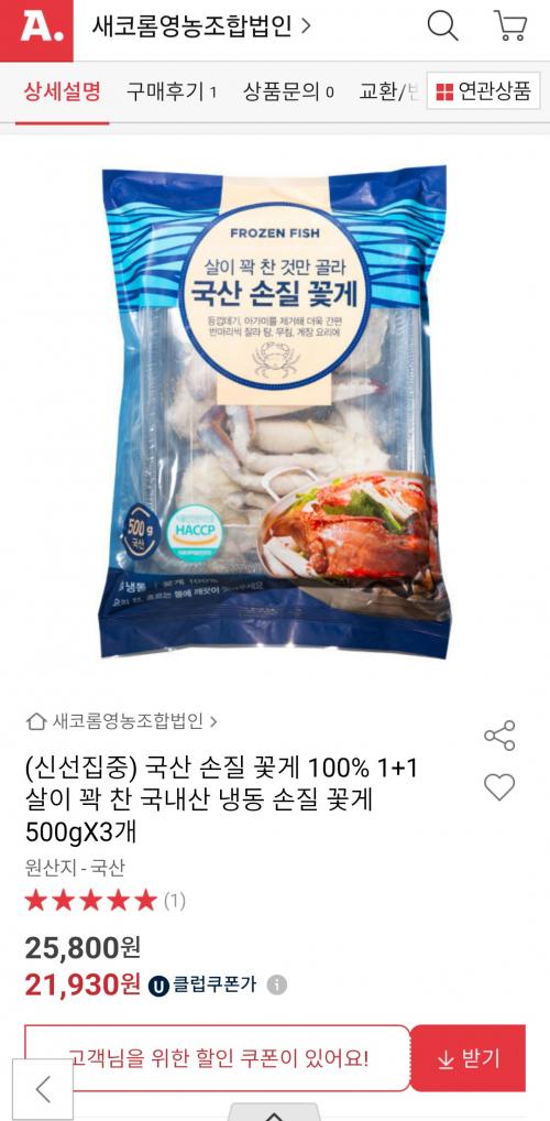 [옥션] 국산 손질 꽃게 1.5kg 유클가(21,930원 / 무배) > 국내핫딜