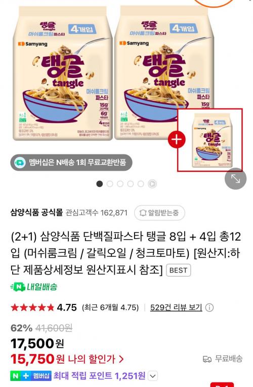 [네이버] 삼양식품 단백질파스타 탱글 8입 + 4입 총12입 (15,750원/무배) > 국내핫딜
