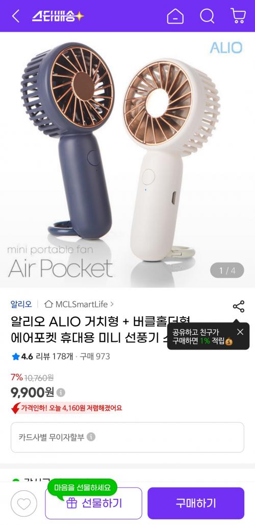 G마켓) 버클 홀더형 미니 선풍기 알리오 (9,900원/유배) > 국내핫딜