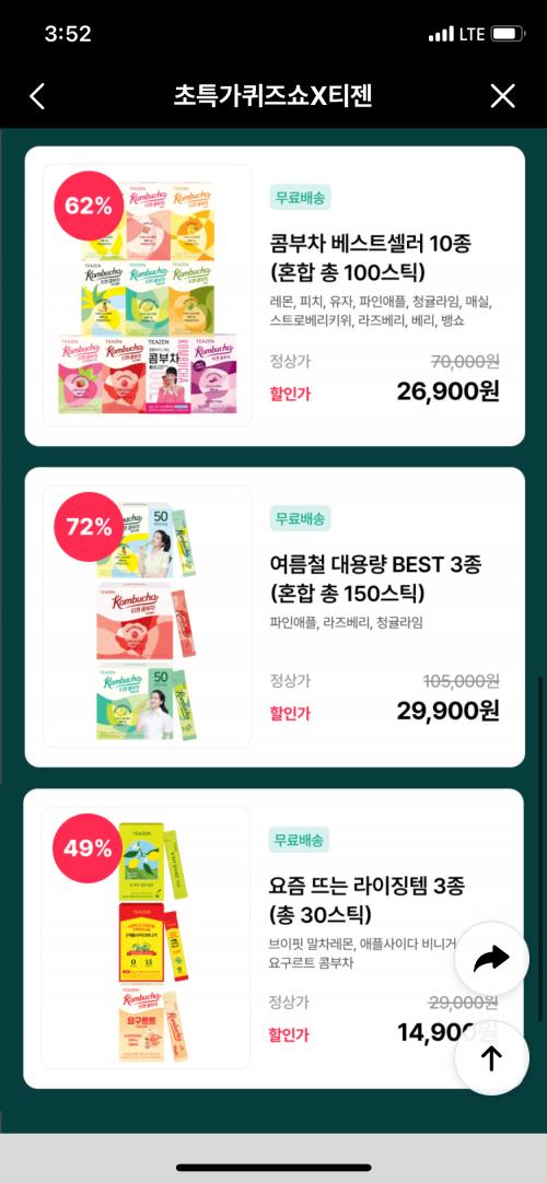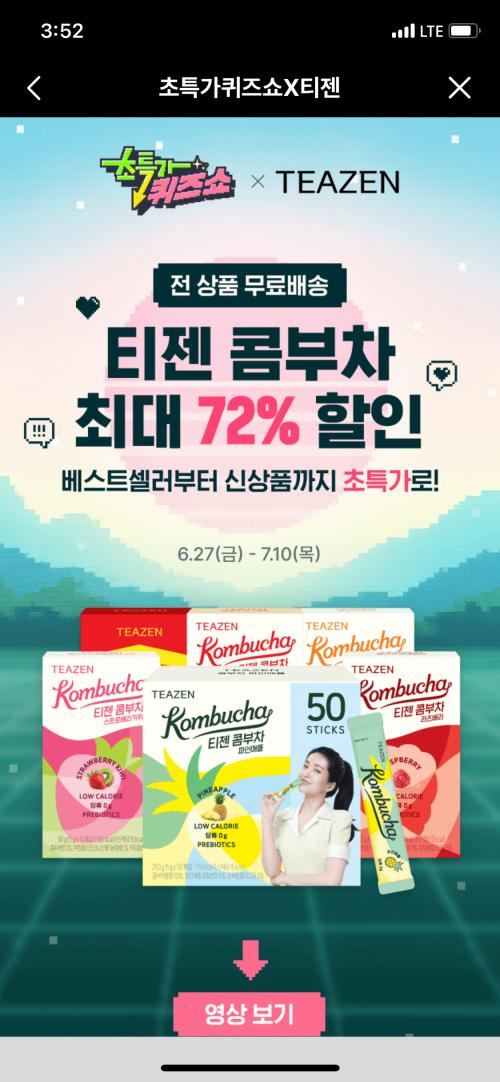 유튜브 <초특가퀴즈쇼>에서 본 티젠 콤부차 특가 소개입니다