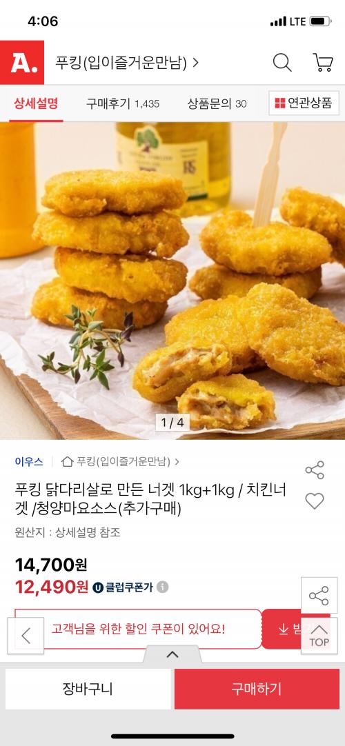 [옥션] 푸킹 닭다리살로 만든 너겟 1kg+1kg (12490원/무배)