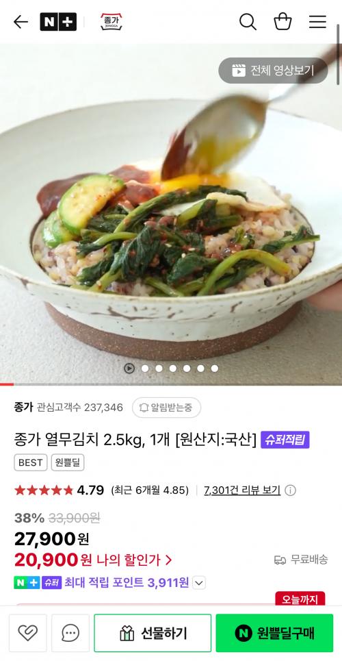 [네이버] 종가 열무김치 2.5kg, 1개(20,900원/무배) > 국내핫딜