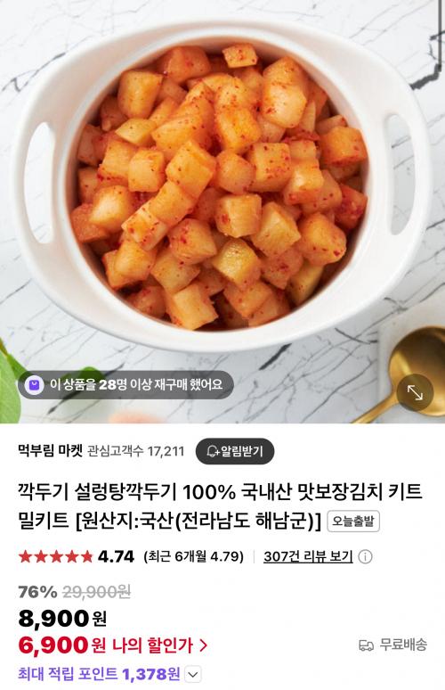[네이버] 국내산 깍두기 1kg (6,900원/무배)