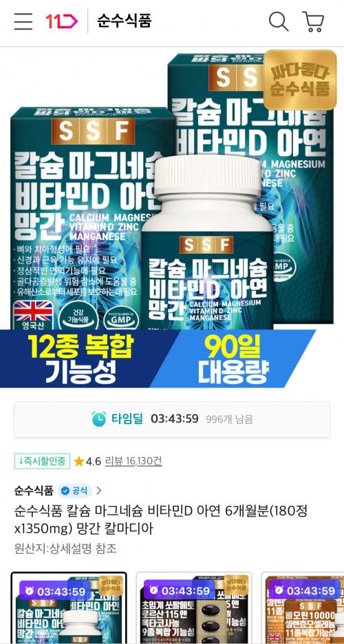 [11번가] 순수식품 칼슘 마그네슘 비타민D 아연 6개월분 180정 (14,900원/무료) > 국내핫딜