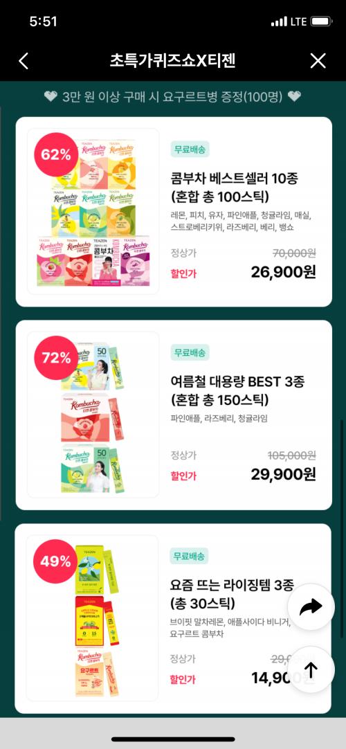 유튜브 <초특가퀴즈쇼>에서 본 티젠 콤부차 특가 소개입니다