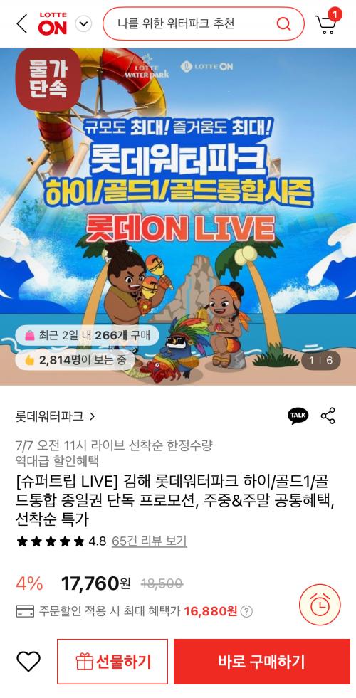 [롯데온] 김해 롯데워터파크 하이 종일권 단독 프로모션 (16,880원/무료) > 국내핫딜