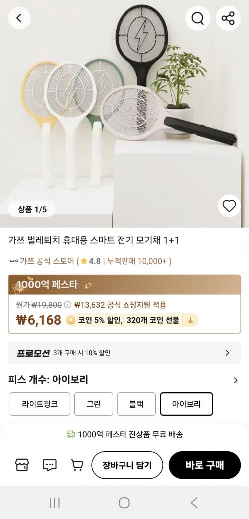 여름에 모기나 벌레들 처치가 쉬운 전기모기채 1+1으로 6,168원 이에요 업청쌉니다