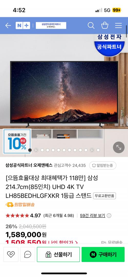 [네이버] 삼성 214.7cm(85인치) UHD 4K TV LH85BEDHLGFXKR 1등급 스탠드 (1,156,836원/무료)