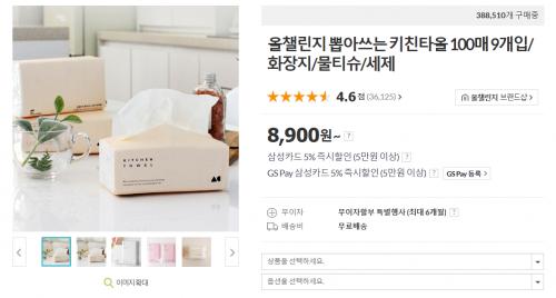 1번 키친타올로는 총 900매에 8,900원 나올거에요