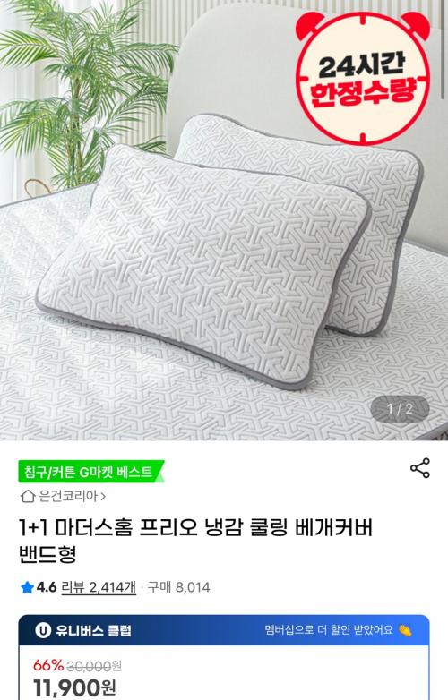 [지마켓] 1+1 마더스홈 프리오 냉감 쿨링 베개커버 밴드형 (11,900원/무료)