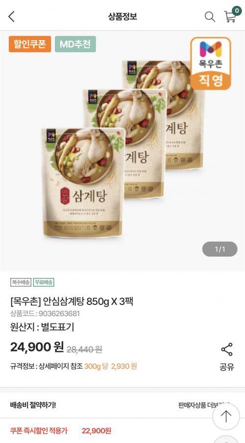 [농협몰] 목우촌 안심삼계탕 850g 3팩 (22,900원/무료) > 국내핫딜