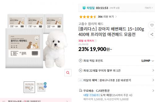 [11번가] 플리다스 강아지 배변패드 15~100g 400매 프리미엄 애견패드 모음전 (19,900원/무료배송) > 국내핫딜