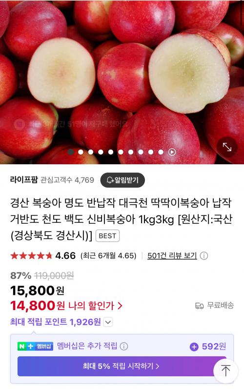 [네이버] 명도복숭아 1kg (14,800원/무배) > 국내핫딜