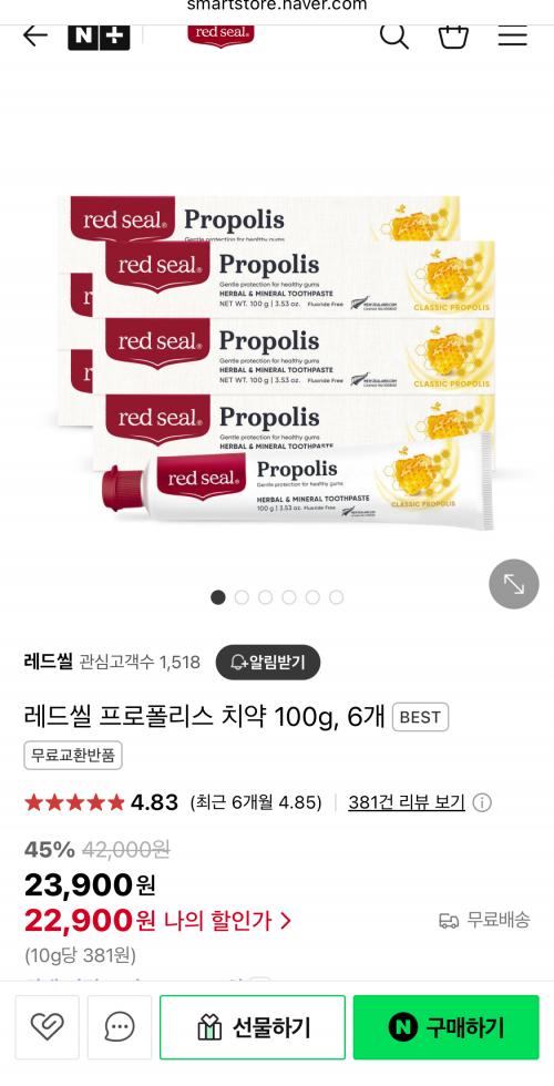 [네이버] 레드씰 프로폴리스 치약 6개+키즈치약 본품 6개 증정 (22,900원/무료) > 국내핫딜