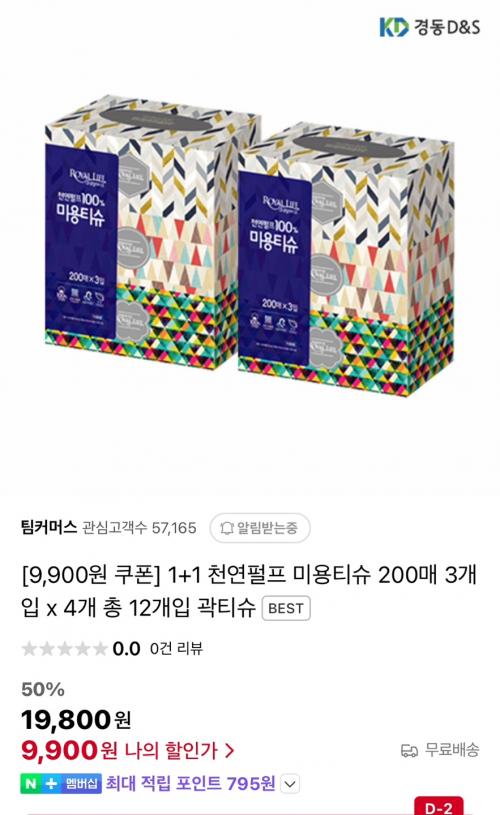 [네이버] 천연펄프 미용티슈(200매 3개입) x 4개 (9,900원/무료) > 국내핫딜