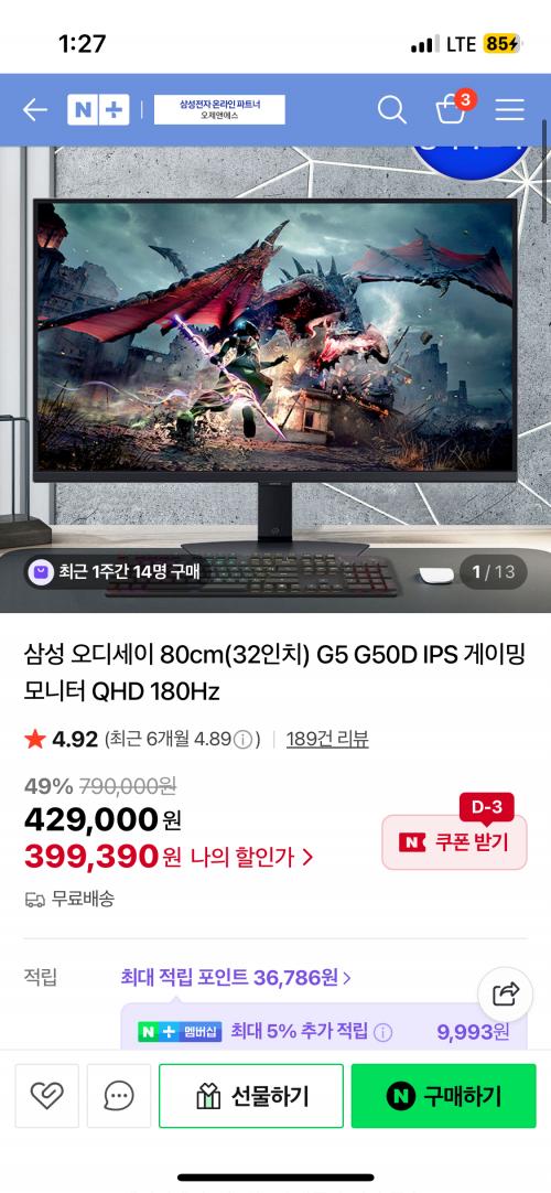 [네이버] 삼성 오디세이 80cm(32인치) G5 G50D IPS 게이밍 모니터 QHD 180Hz (349,444원/무료)