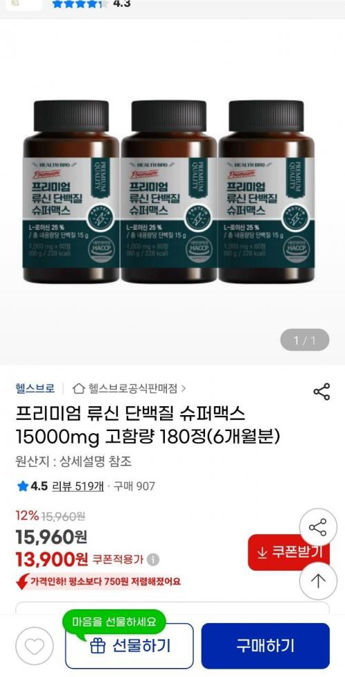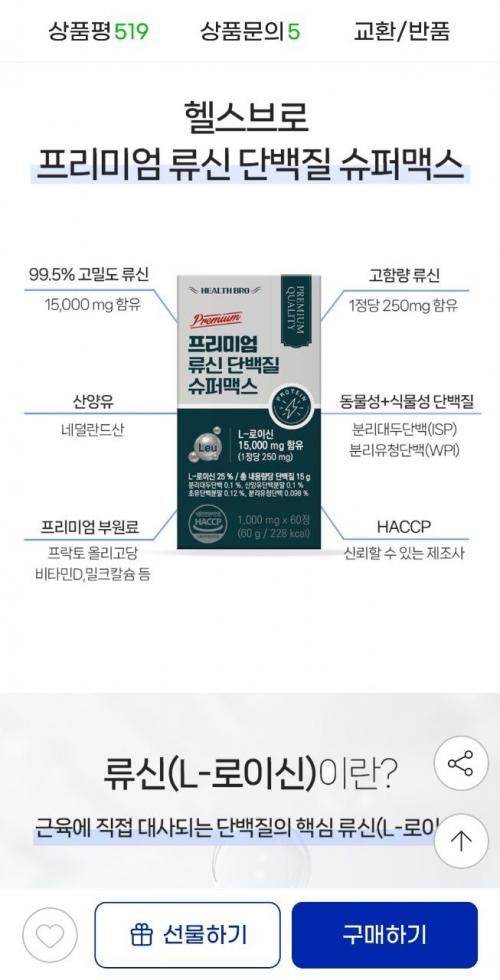 [G마켓] 프리미엄 류신 15000mg 고함량 180정 6개월분 (13,900원/무배) > 국내핫딜