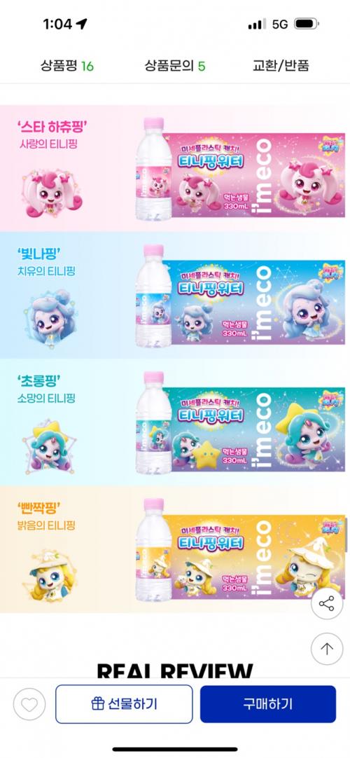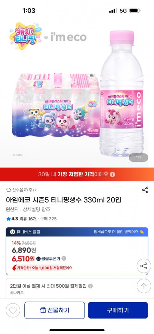 [G마켓] 아임에코 티니핑생수 20개 330ml (6,890원/무배) > 국내핫딜