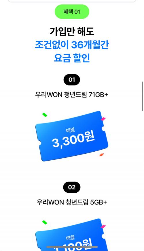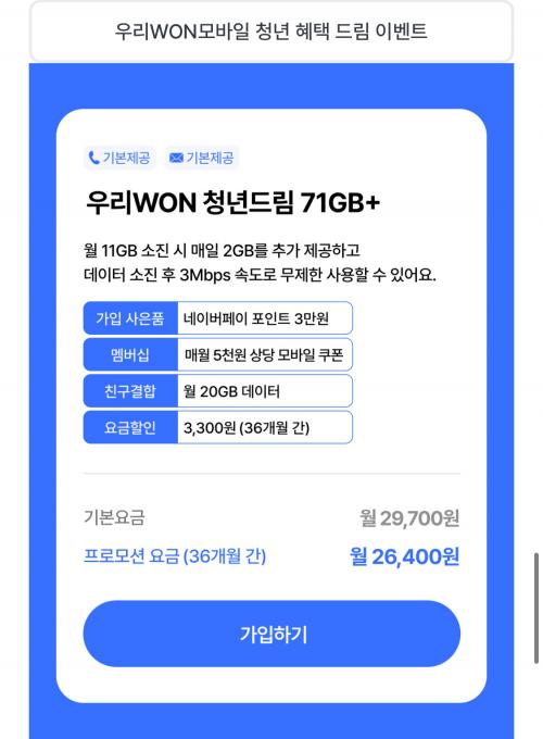 우리은행 통장있어야하고 36개월 무제한 요금제 26,400원(프로모션가)
