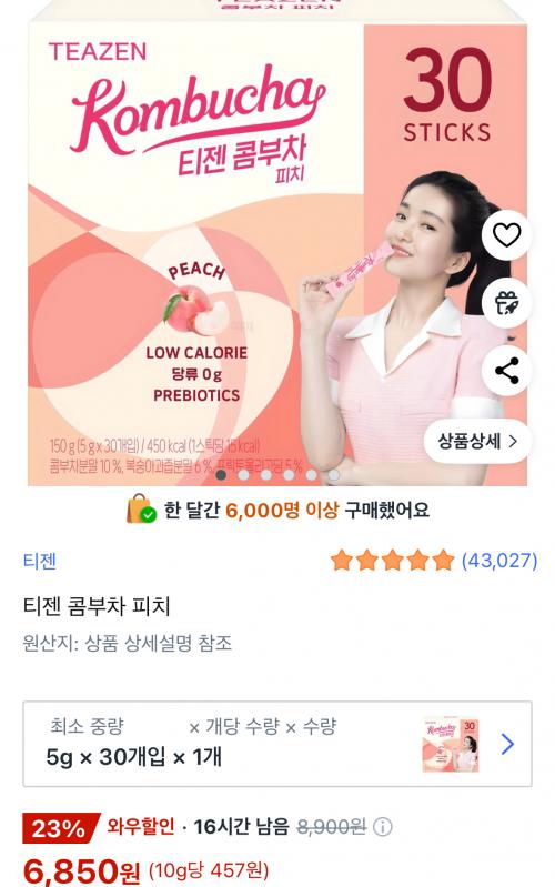 [쿠팡와우] 티젠 콤부차 피치 5g 30개 (6,850원/무료) > 국내핫딜