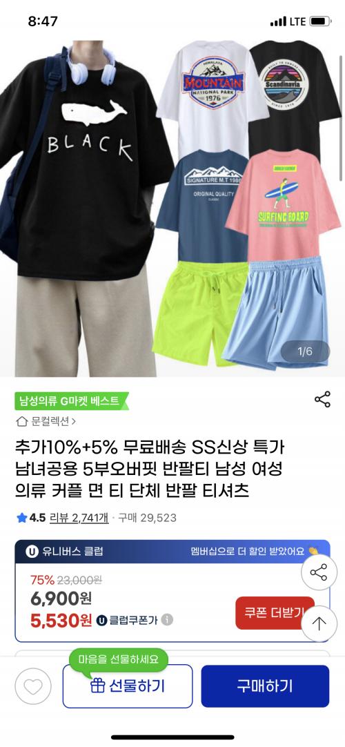 [지마켓] 남녀공용 5부 오버핏 반팔티, 반바지 등 할인 (6,900원/무배)
