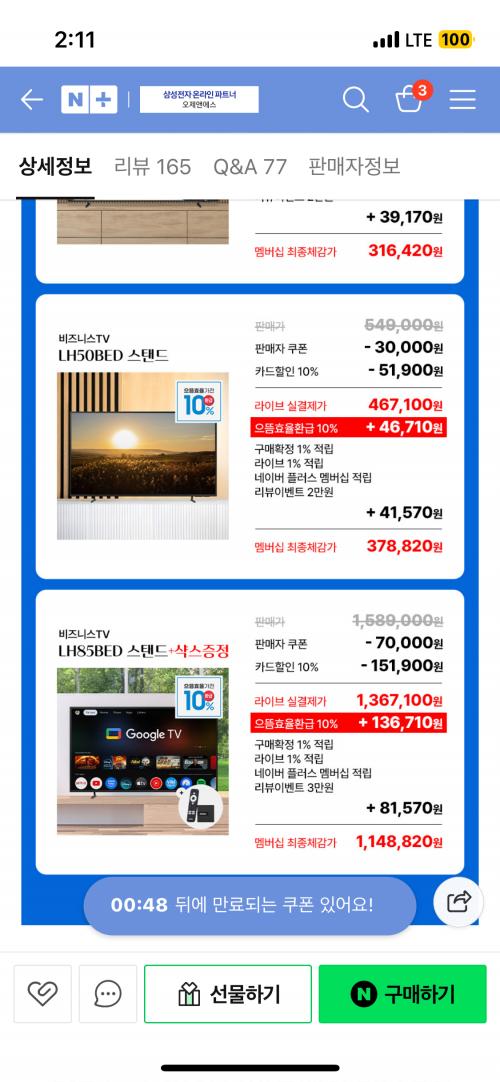 [네이버] 혜택가 122만 삼성 214.7cm(85인치) UHD 4K TV LH85BEDHLGFXKR 1등급 스탠드 (1,148,820원/무료)