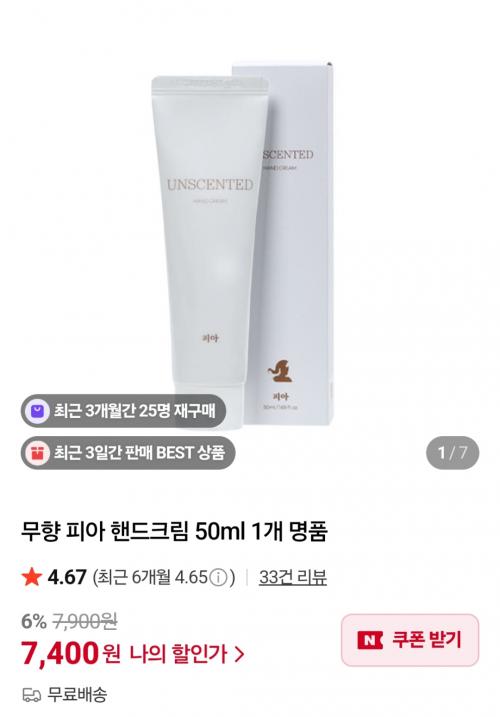 [네이버] 피아 핸드크림 50ml 1개 (7,400원 / 무료)