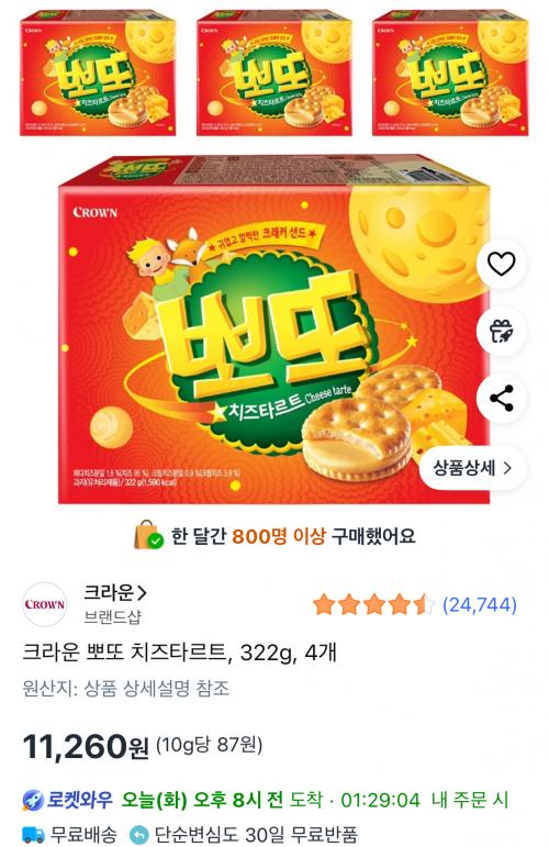 [쿠팡] 크라운 뽀또 치즈타르트 322g 4개 (11,260원/와우무료)