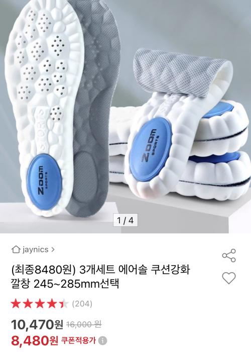 쿠션 깔창 3켤레세트 15%+4%중복쿠폰 받으면 8,480원 나옵니다