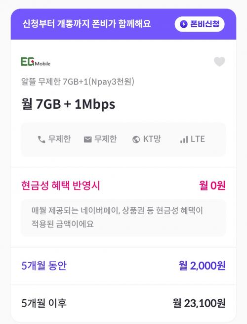 7GB 월 2천원인데 매달 네이버페이 3천원