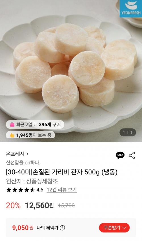 [롯데온] 손질된 가리비관자 30-40미 (9,050원 / 무료)