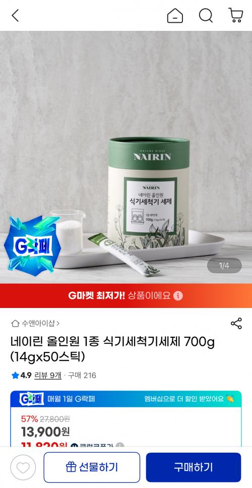 [지마켓] 올인원 1종 식기세척기 세제 14g 50스틱 (13,900원/무배)