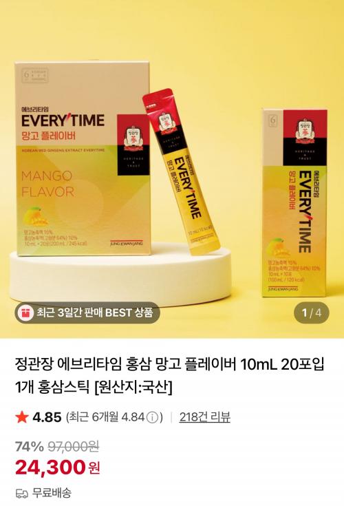 [네이버] 정관장 에브리타임 망고 플레이버 10ml 20포 (24,300원/무료)