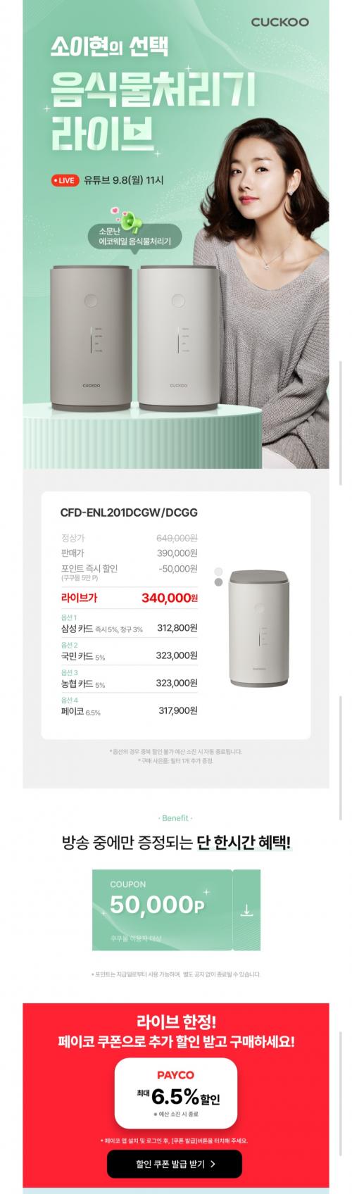 쿠쿠몰 라이브에서 음식물처리기 라이브 포인트 5만 지급하고 최대 52% 할인합니다