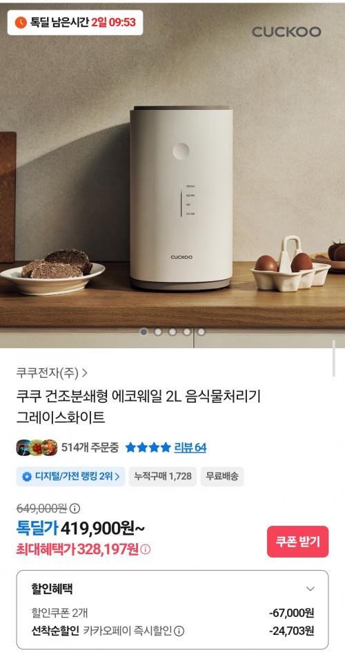 [카카오] 쿠쿠 건조분쇄형 음처기 (328,197원/무배) > 국내핫딜