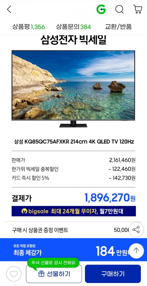 카드할인까지 적용하면 1,896,270원에 사운드바 증정 있고 상품권 5만 증정 있습니다. 체감 184만으로 가격 잘 나왔습니다.