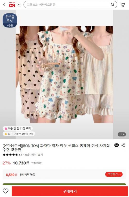 여성용 파자마 추석할인 쿠폰 받아 모두 적용하면 8540원 무배