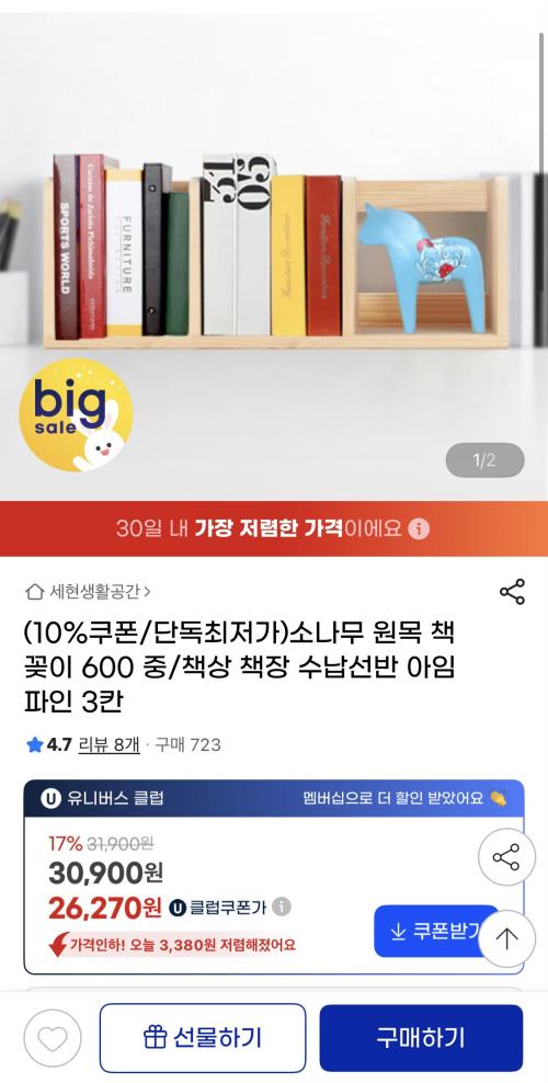 [지마켓] 소나무 원목 책꽂이 600사이즈 3칸 (26,270원/무배)