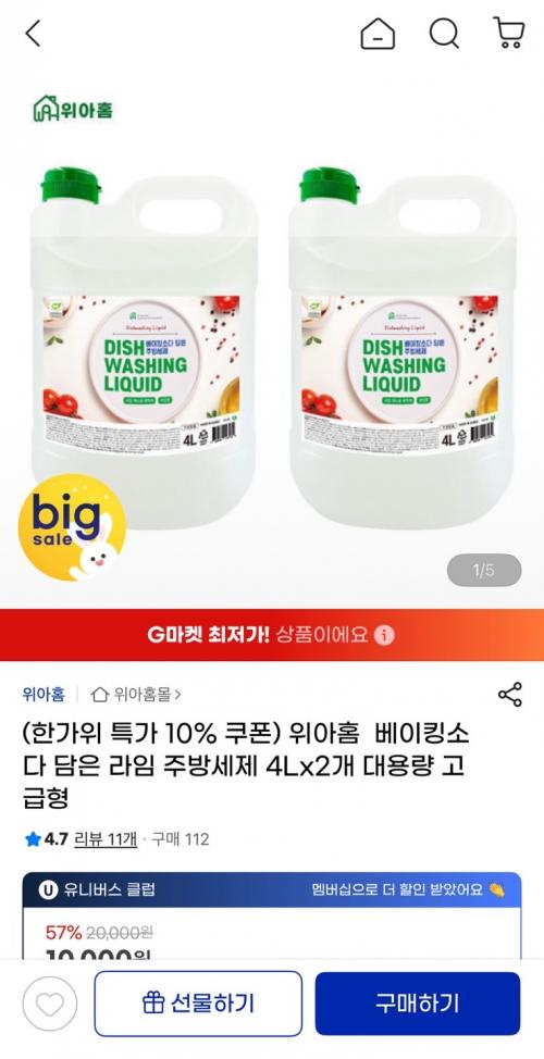 [지마켓] 위아홈 베이킹소다 주방세제 라임 4L X 2개 (유클 8,500원/무배) > 국내핫딜