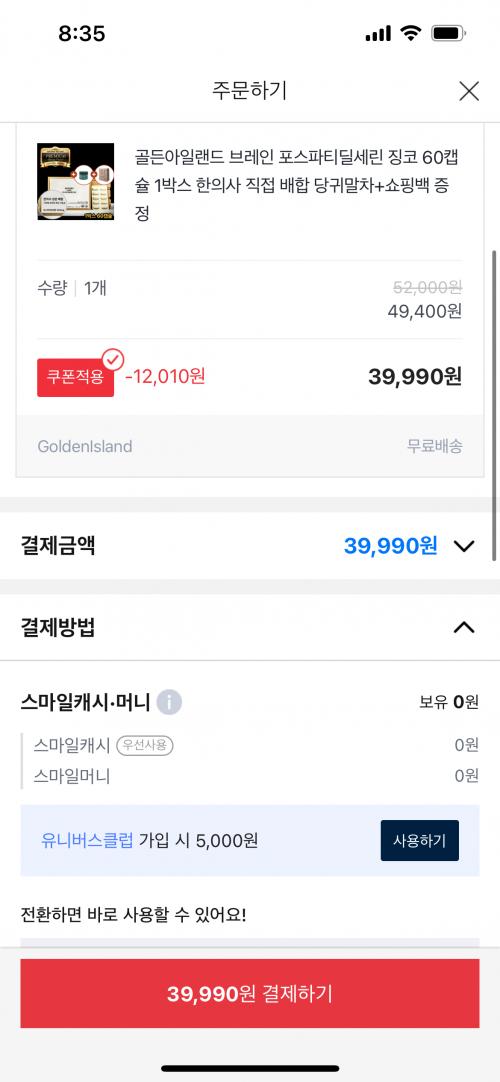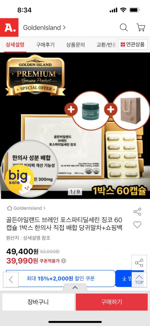 [옥션] 골든아일랜드 브레인 포스파티딜세린 징코 60캡슐 1박스 (39,990원/무료) > 국내핫딜